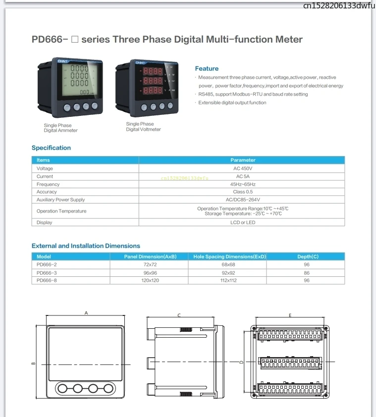 CHINT PD666 Series Multifunctional LCD Digital Display Meter RS485 Current and Voltage Meter Three-phase 23468S3