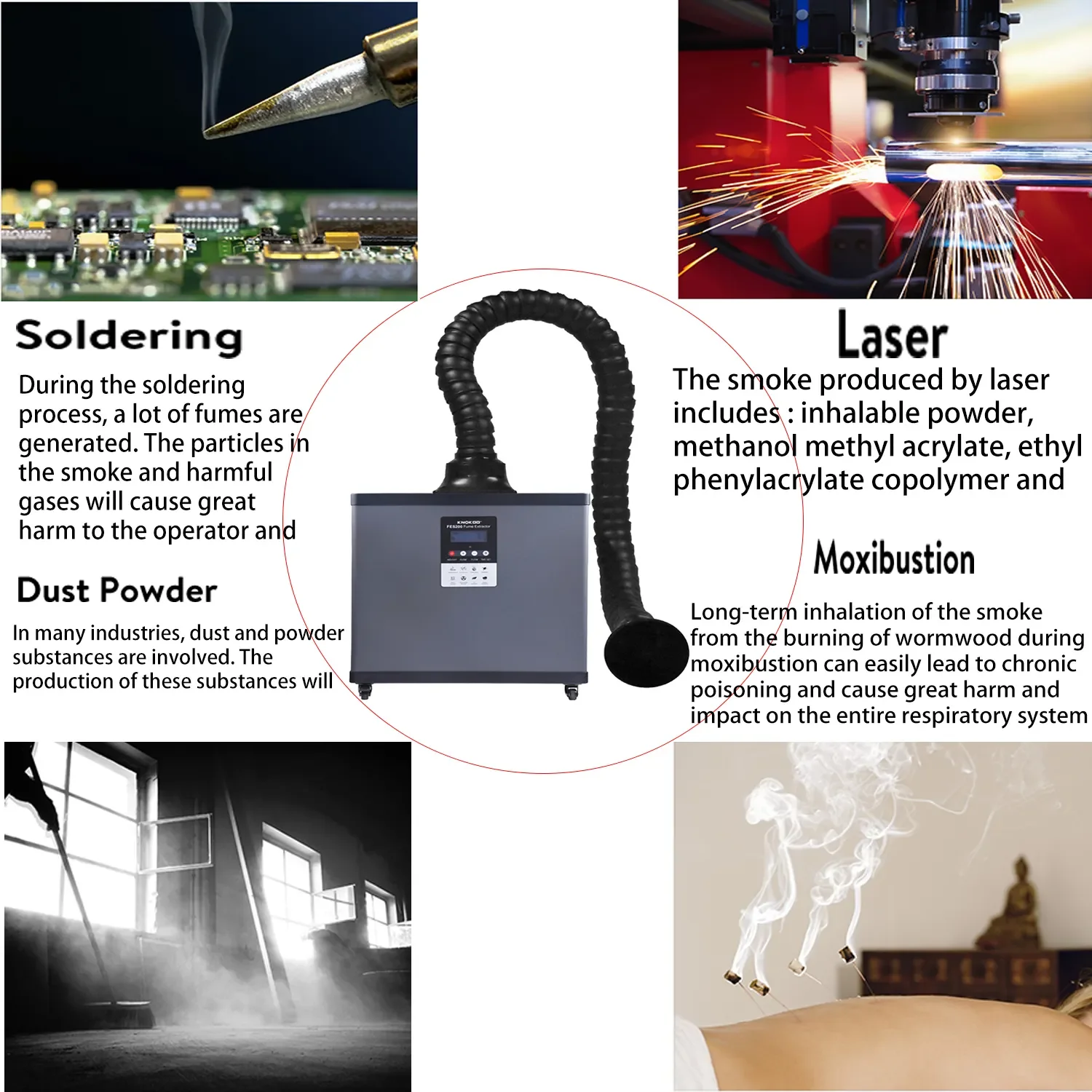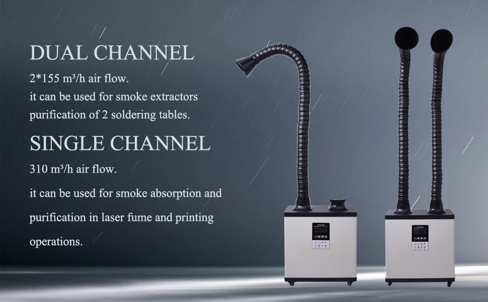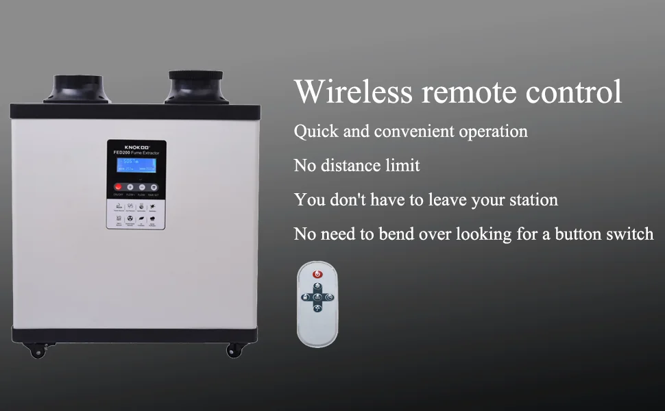 KNOKOO Solder fume extractor exhaust and purify air by the 210W DC motor , suitable for soldering station and small laser marking. Brushless motor, low noise and high speed. The airvolume can be adjusted freely. High inhalation power and high smoking efficiency.