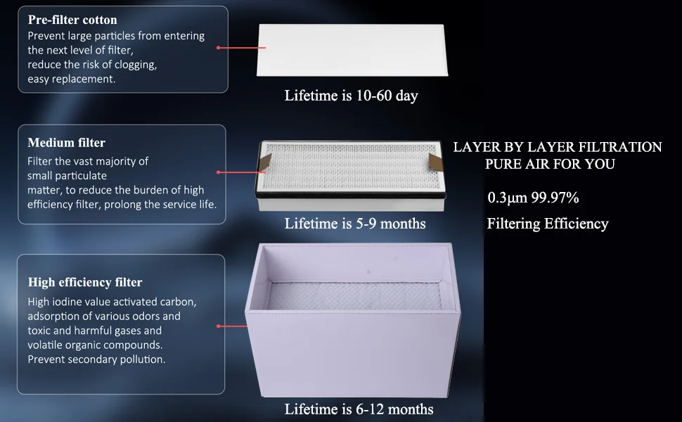 Multiple filtration system (3 layers)-fume absorber continuously exhaust the welding fume and lead mist, and rapid discharges it into the Pre-filter, HEPA filter and activated carbon filter to purifier smoke and unpleasant odors. The three-layer filter cotton of primary, medium and main filter elements can be replaced separately, which prolongs the service life and reduces the cost of use.